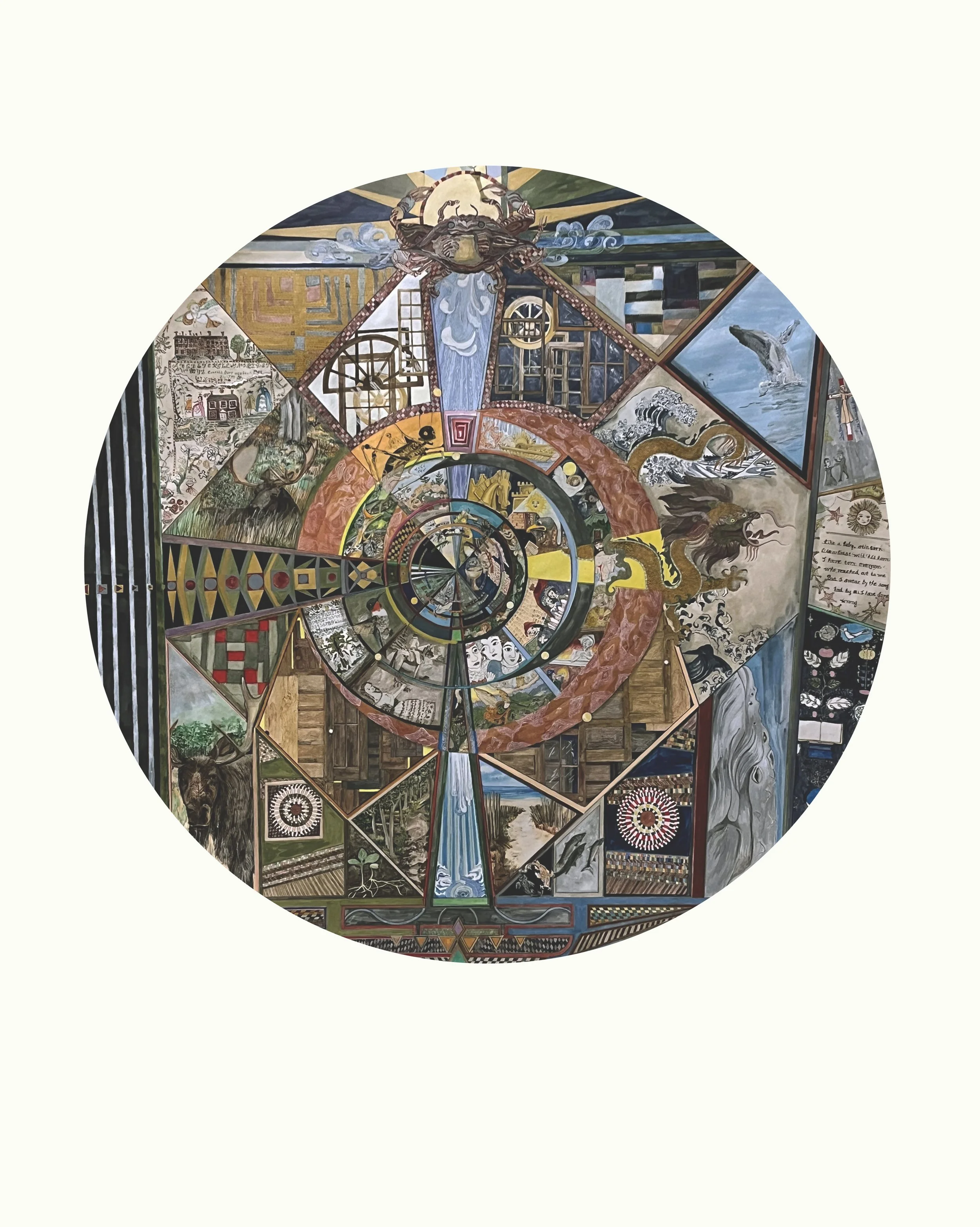 In this series of works I have demonstrated the skills I have acquired, repurposed old pieces in the forms of weaving and collage, honored traditional artmakers and outsider artists, and hidden my thoughts and philosophies. For the most part each of these pieces have taken several years to complete. I would work fervently on them when I had things on my mind that I could confront through the “sampler,” then I would set it aside while I worked on something else.